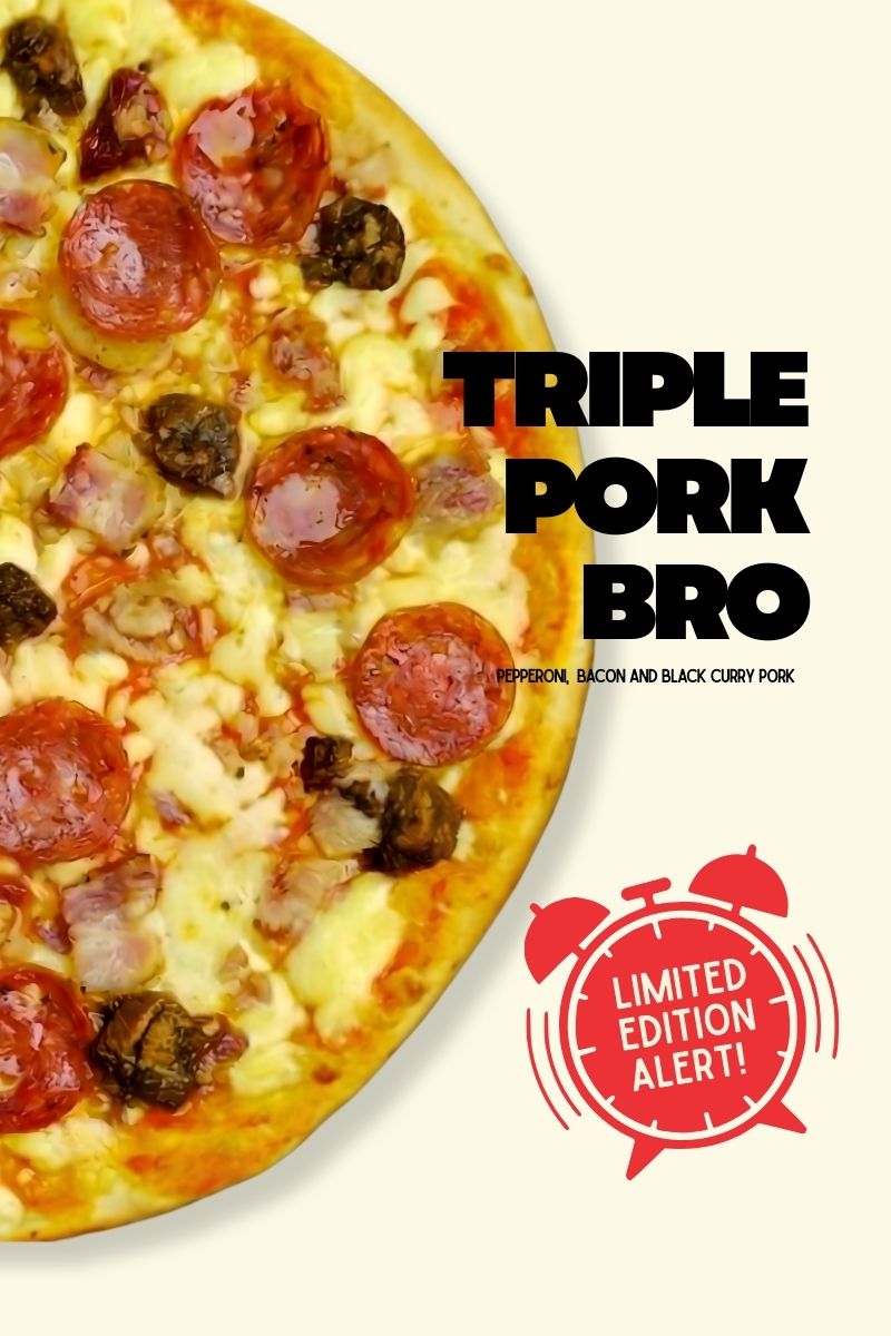 MOZZARELLA, CHICKEN HAM, BBQ CHICKEN, BLACK CURRY PORK, CHICKEN SAUSAGE, BACON, CHICKEN SALAMI, & TOMATO SAUCE